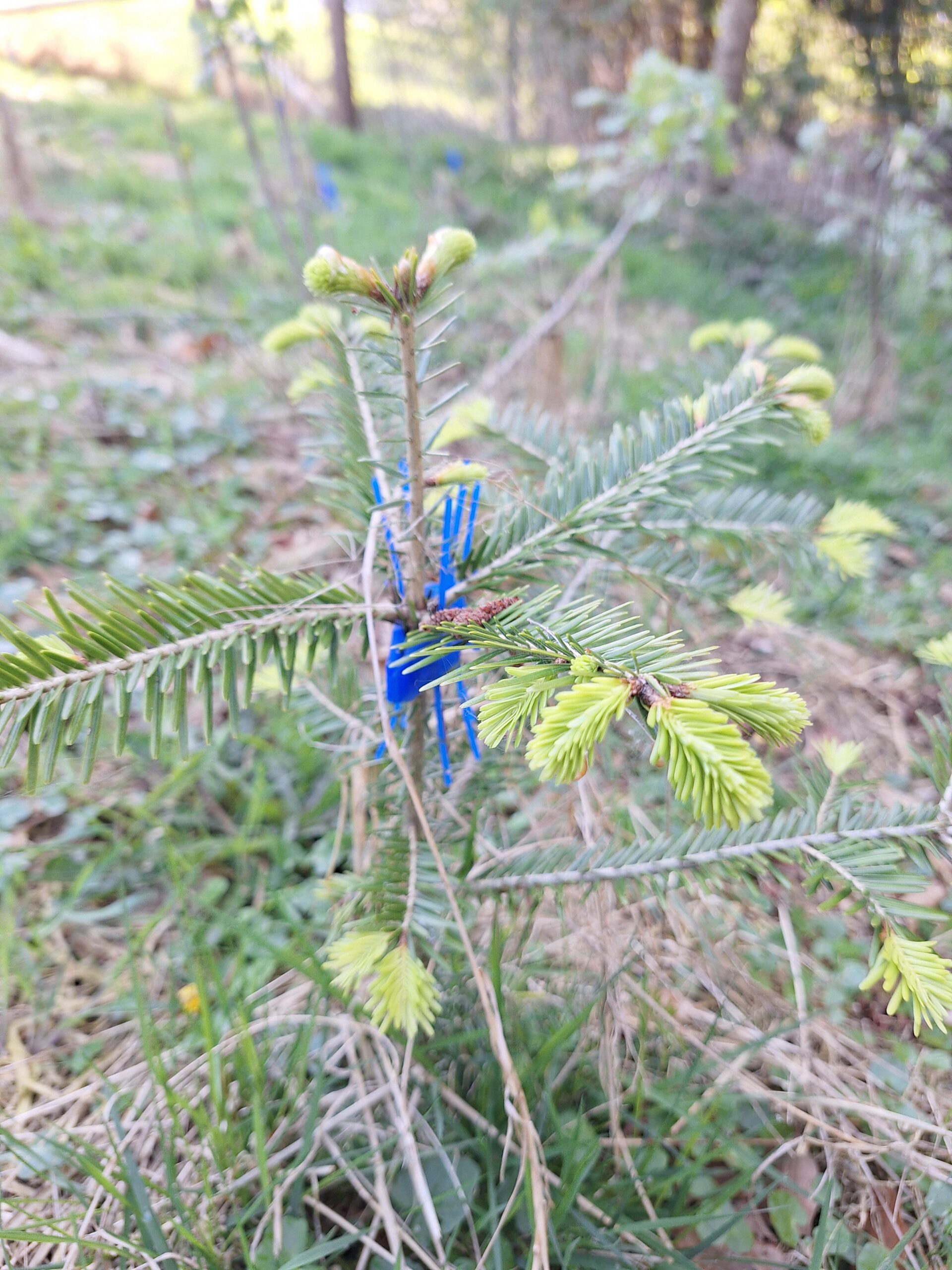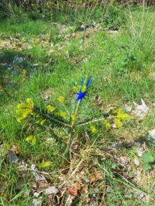 Während eine Gruppe weiter Disteln niedertrat, wechselte eine andere Gruppe dann zu den Anpflanzungen der Weißtannen. Hier musste der Verbissschutz, der die jungen Pflanzen vor hungrigen Rehen, aber auch Kaninchen schütz, umgesetzt werden. Dazu musste die Klammer entfernt und etwas höher wieder angebracht werden.